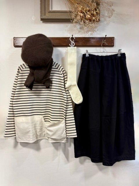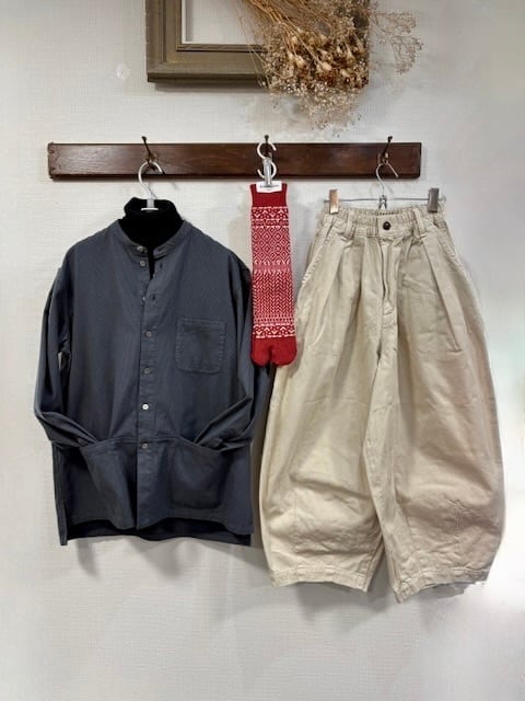 複雑な切り返しによって立体的なシルエットを作り出したワイドパンツです。 腰回りはスッキリと収まりが良く裾に向かって自然なワイドラインを作りますが広がらないため全体的に見ると甘さを抑えた洗練された印象になります。 カジュアル系にもキレイめ系にも合わせやすい万能性が魅力で、かつ動きやすさも兼ね備えているため日常的にとても活躍するアイテムです。 使用している生地はデニムのような質感なので秋冬シーズンのみならずほぼ一年中違和感なく着用していただけます。 ☆ジンバブエコットン ☆ ジンバブエコットンとは、ジンバブエ共和国の高地で無農薬栽培され、一つひとつ手摘みで収穫される最高級の超長綿(ちょうちょうめん)です。 繊維が長く、機械を使わない手摘みで採取されるため繊維が傷みにくく、非常に丈夫で柔らかい上質な糸を作ることができます。 この原綿をムラのある太さに紡いだ糸を使い、経糸と緯糸を斜めに交差させたデニム特有の織り方で仕立てました。 高級感のある光沢と柔らかさが楽しめるデニム生地です。 *染色の特性上、多少の色落ちがあります *タンブラー乾燥、スチームアイロンはお避けください 素材:コットン100% サイズ:ウエスト68-84cm・ヒップ152cm・股上43cm 股下54cm・ワタリ巾50cm カラー:ベージュ / カーキ / ブラック *着用写真はカーキです 日本製