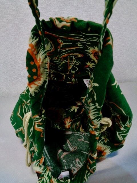 ヴィンテージのアロハシャツからインスパイアされた夏らしさ満載の生地を使用したブランド定番型の巾着バッグです。