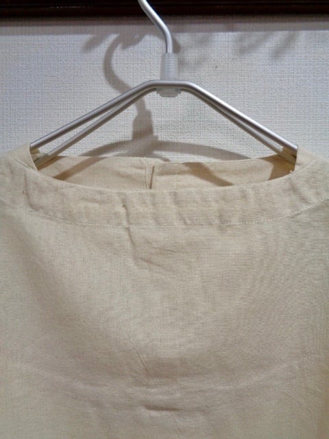 前から見るととてもシンプルですが、後ろ身ごろのラウンドヨークと水牛のボートボタンがさりげないポイントとなって目を惹きます。