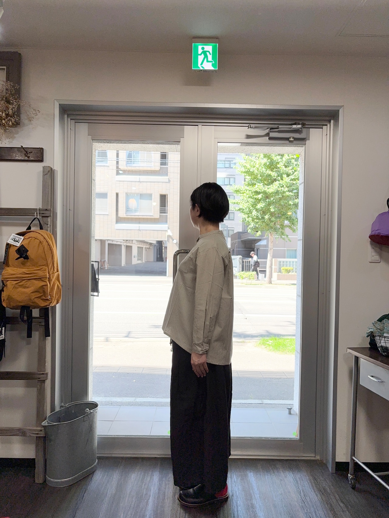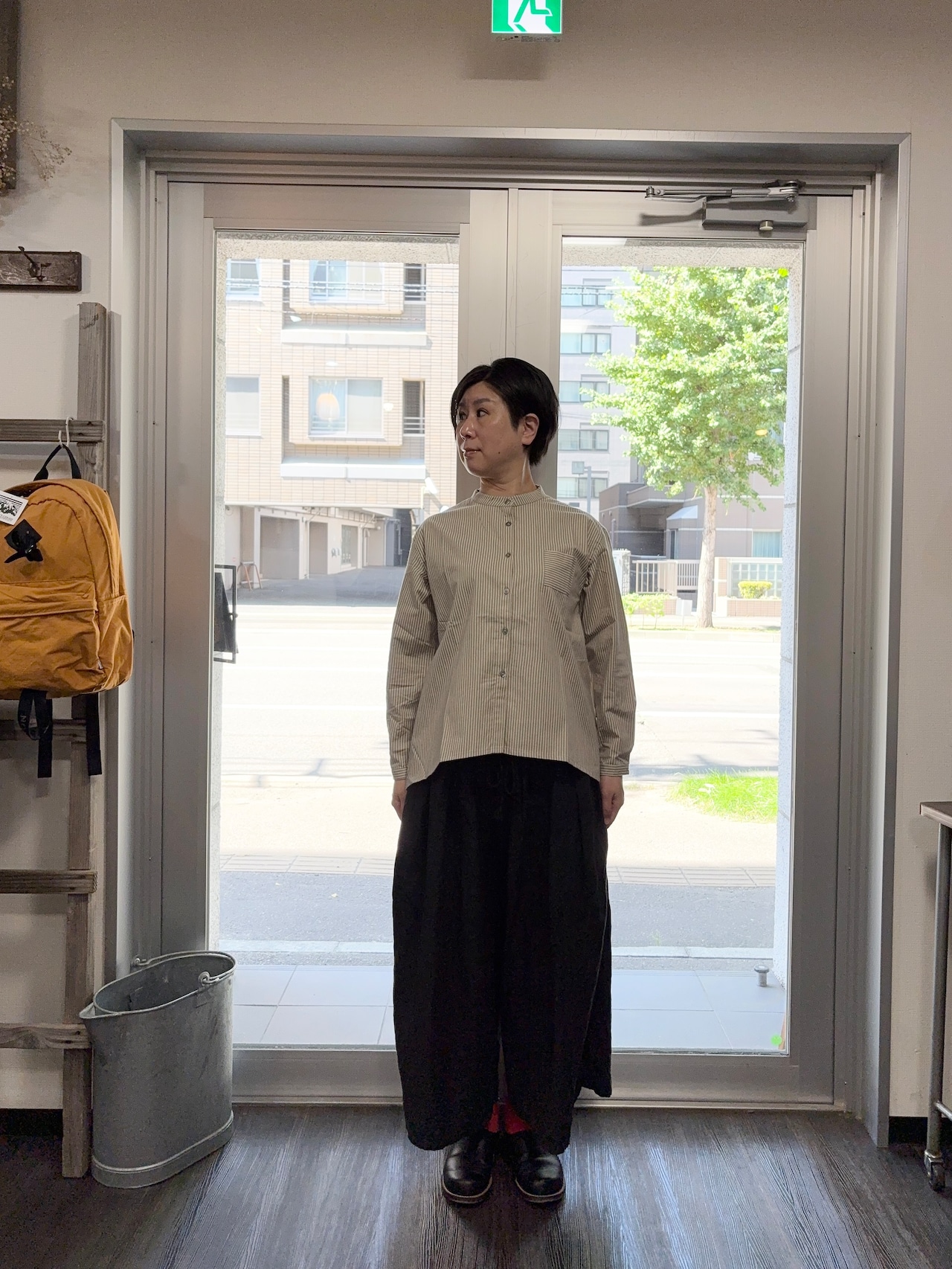 シサム工房・オーガニックコットン タテシマスタンドカラーシャツ・グレー