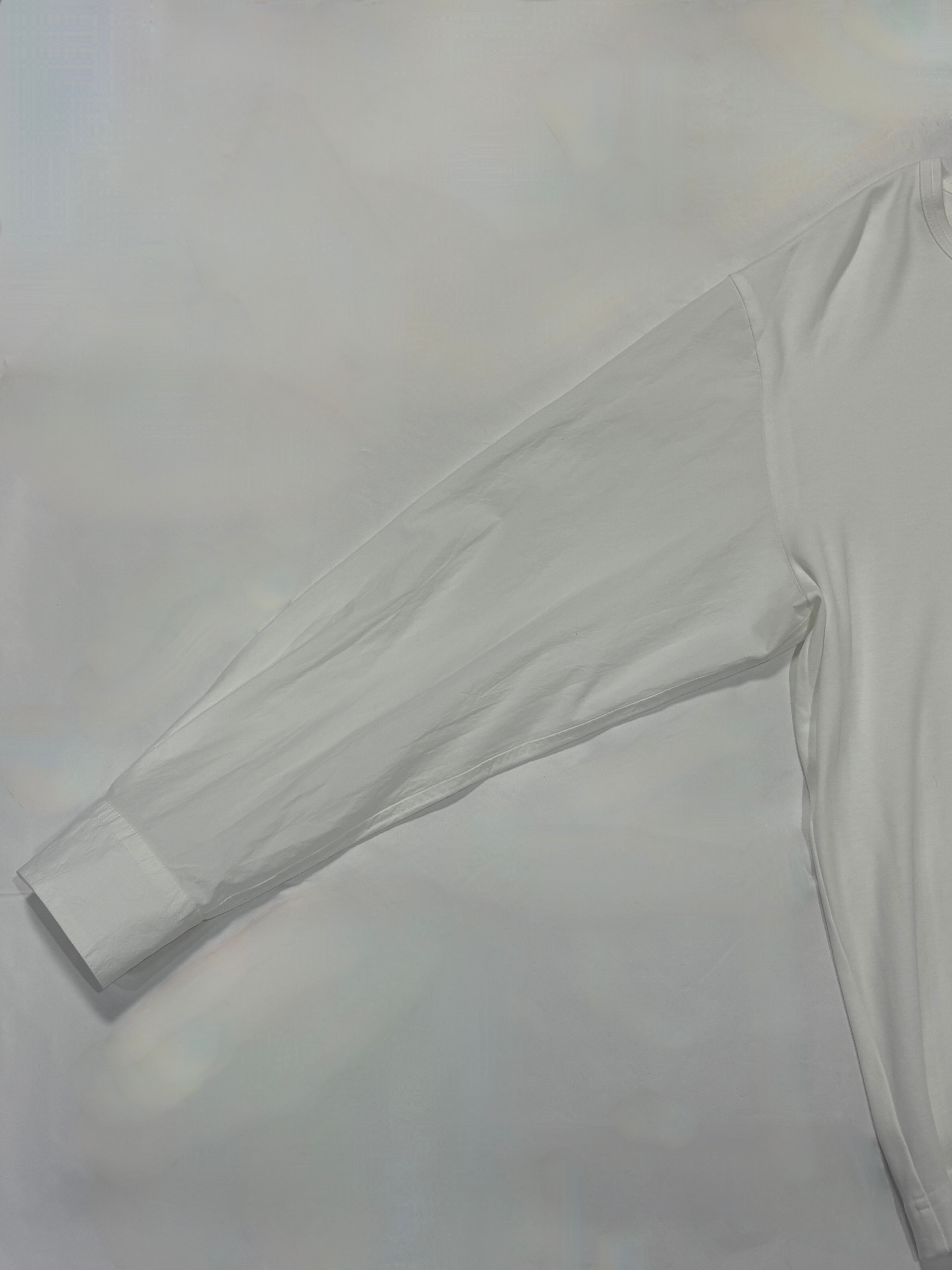 袖に程よいハリ感のある綿近江晒、身ごろに素肌に心地よい綿スムース生地を組み合わせた変則的カットソーです。