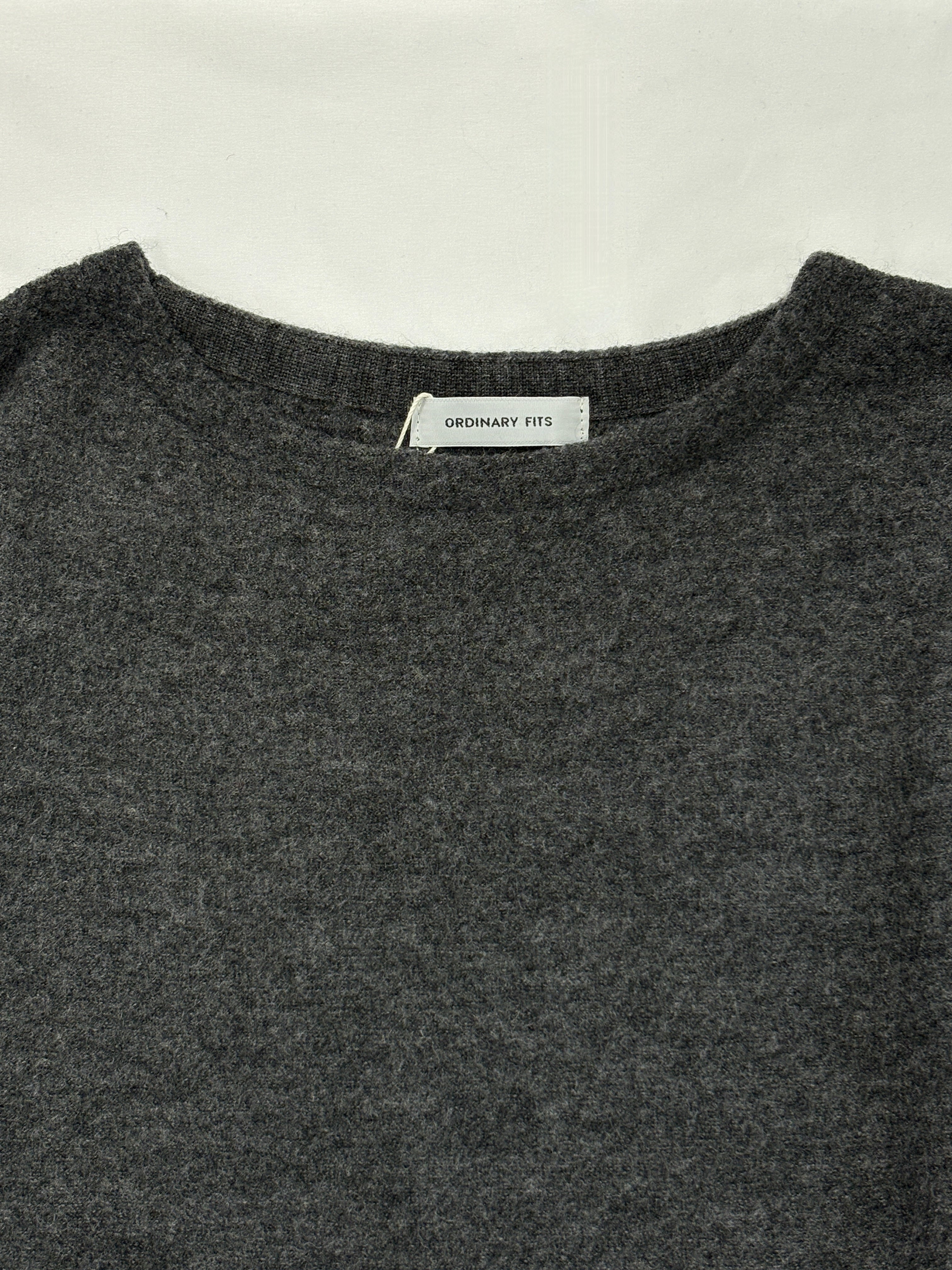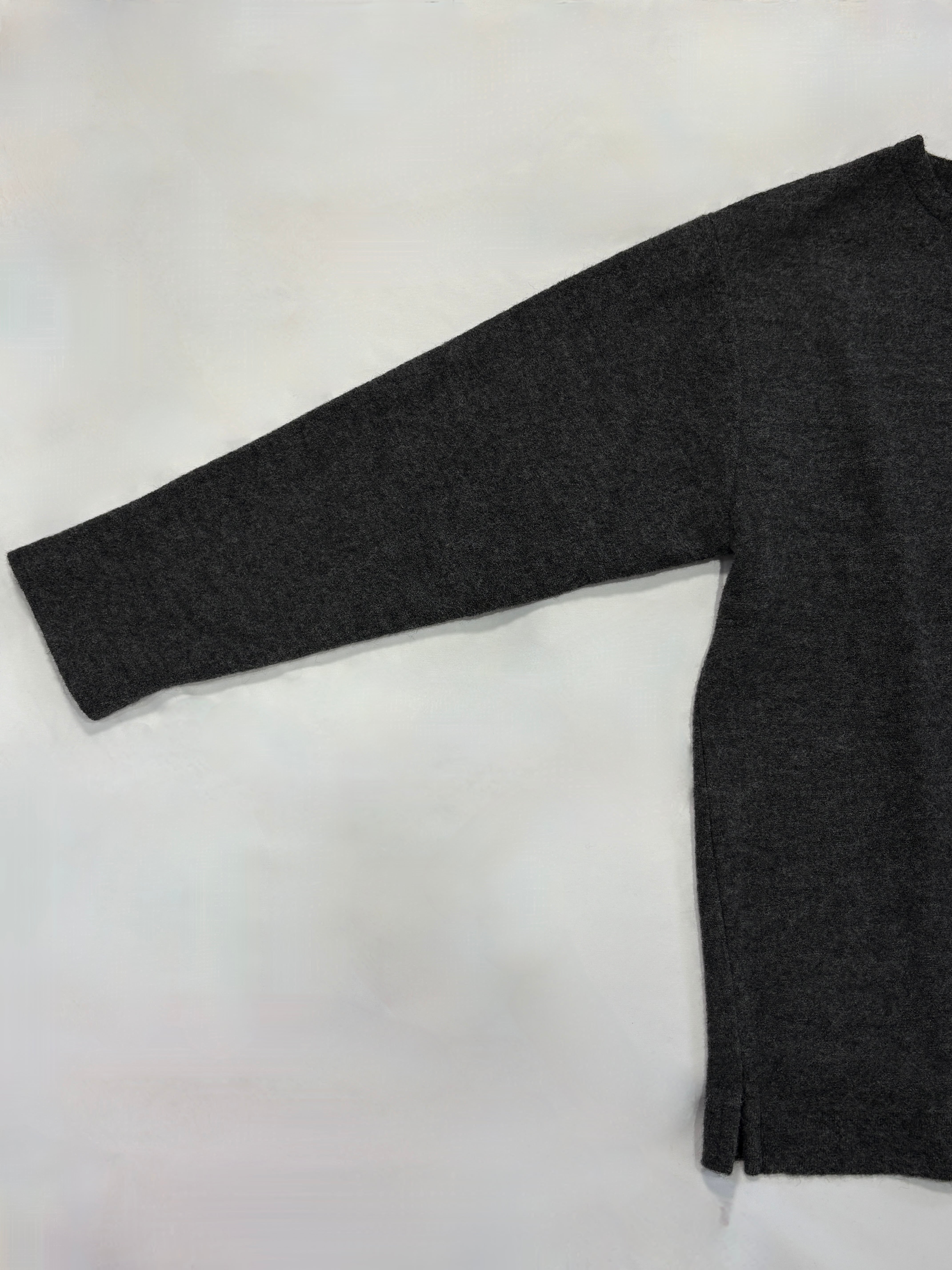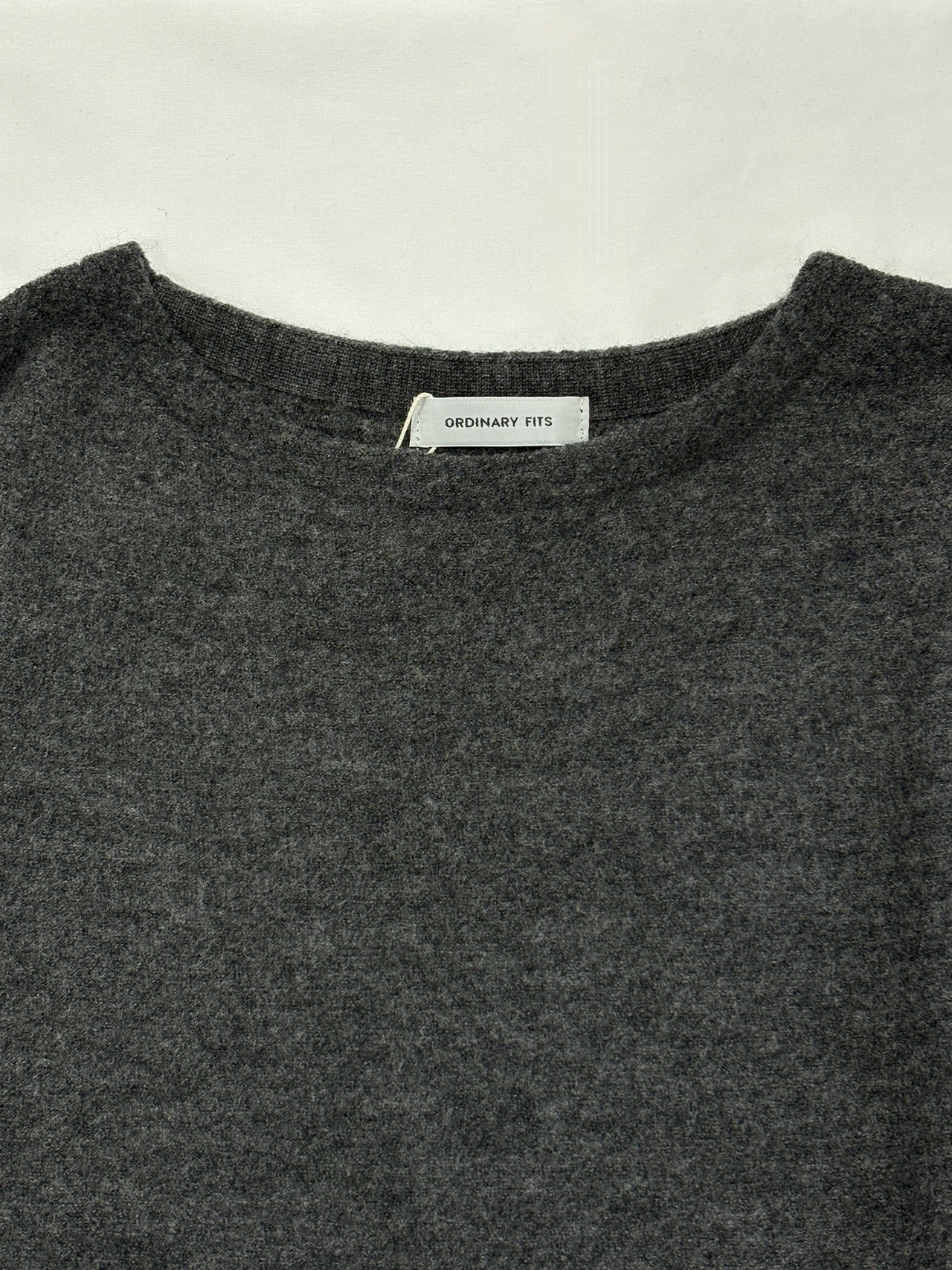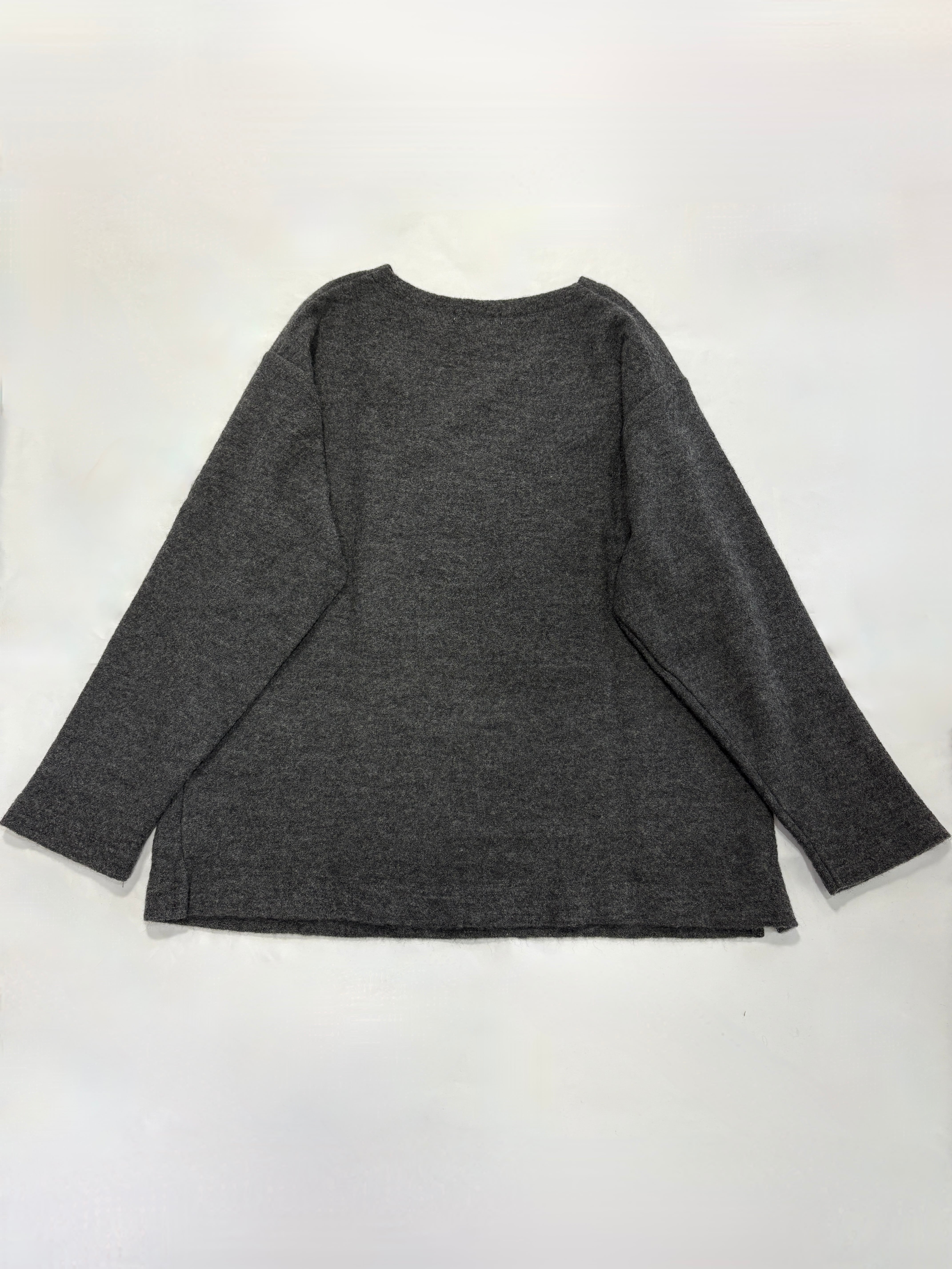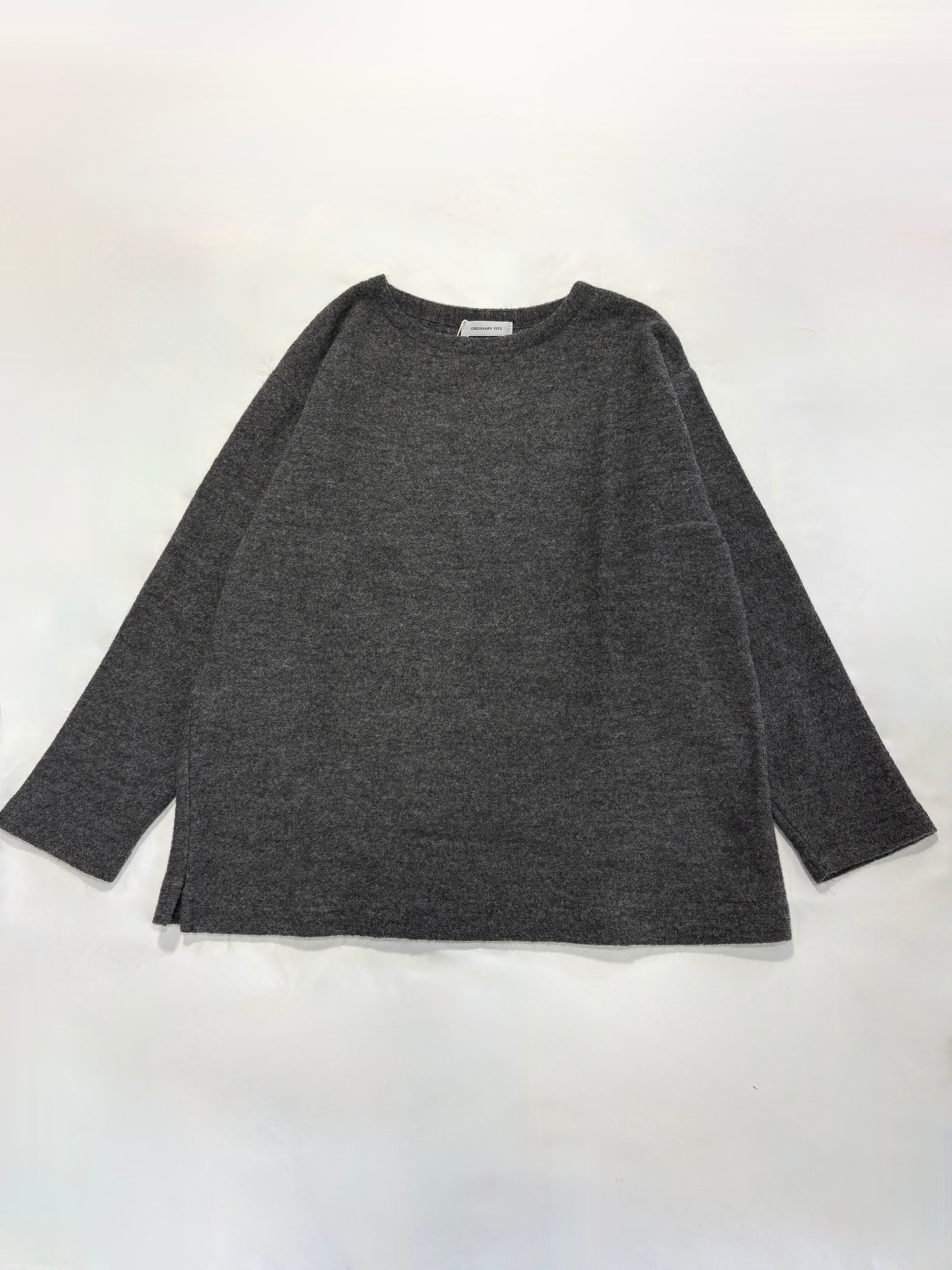 素材はウールの梳毛糸を100%使用し編み立てた編み地をさらに縮絨させたフエルトのような質感のニットです。