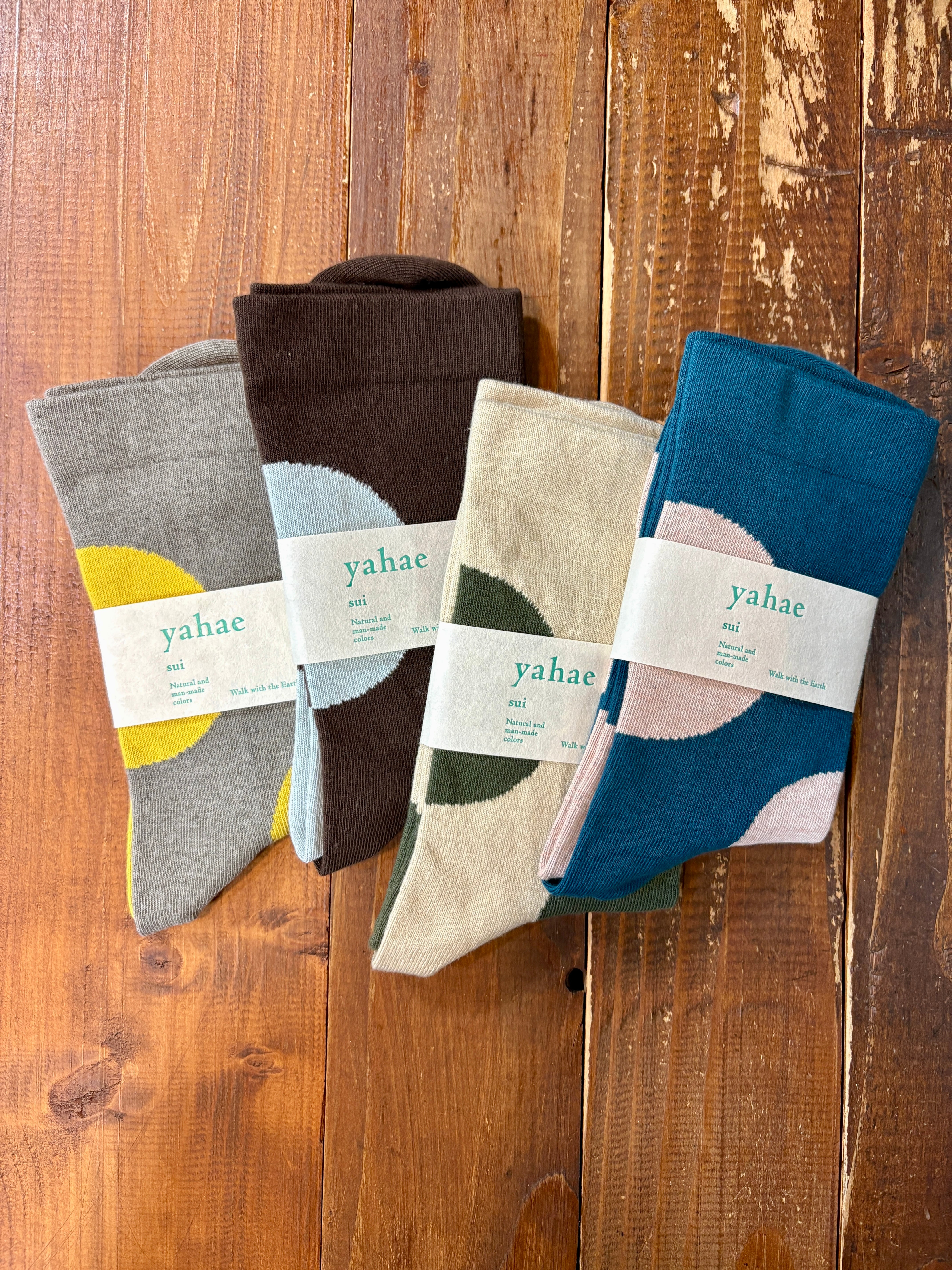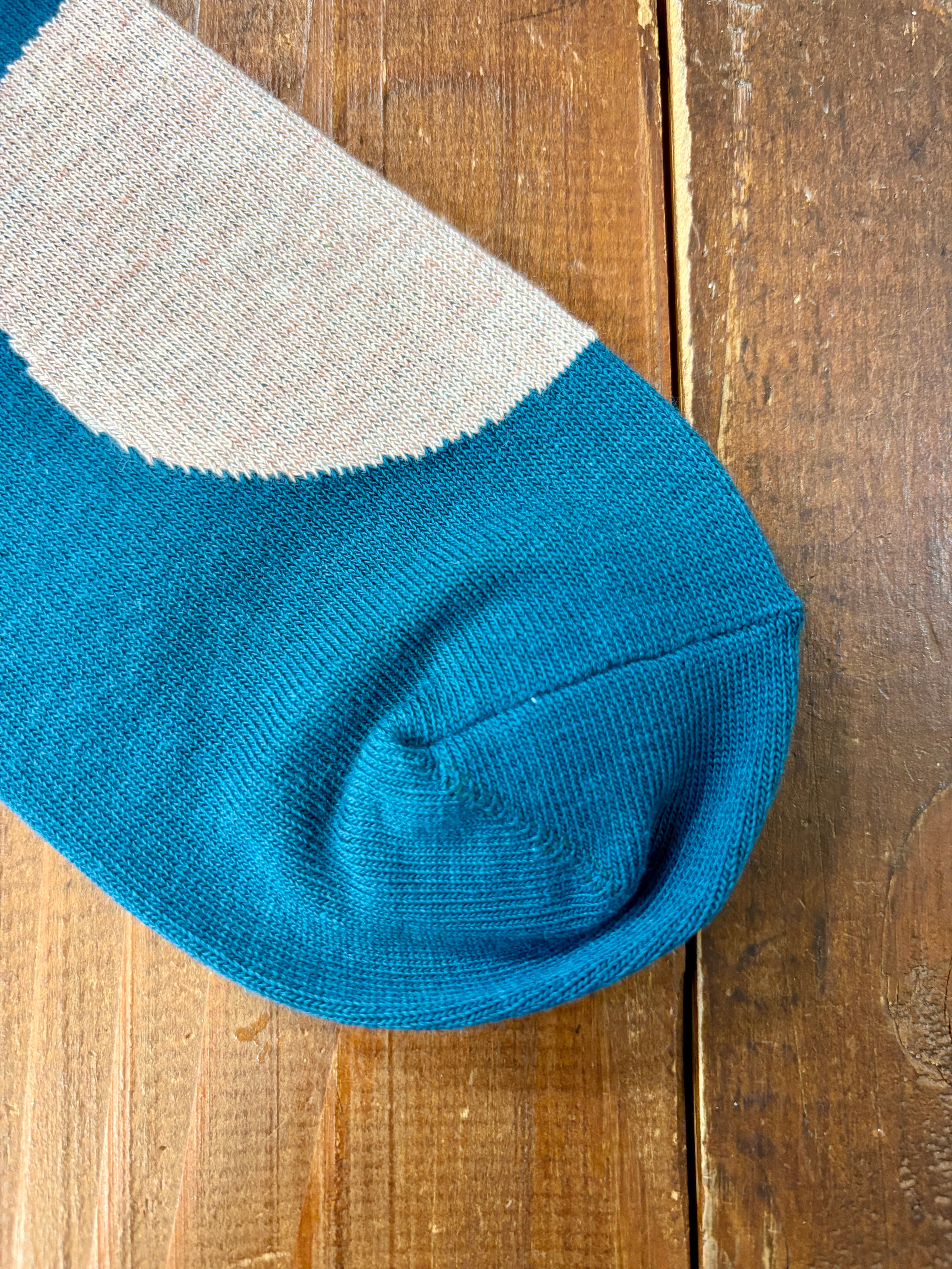 オーガニックコットンで編み立てた大きなドットが印象的な通年対応のミドルゲージソックスです。