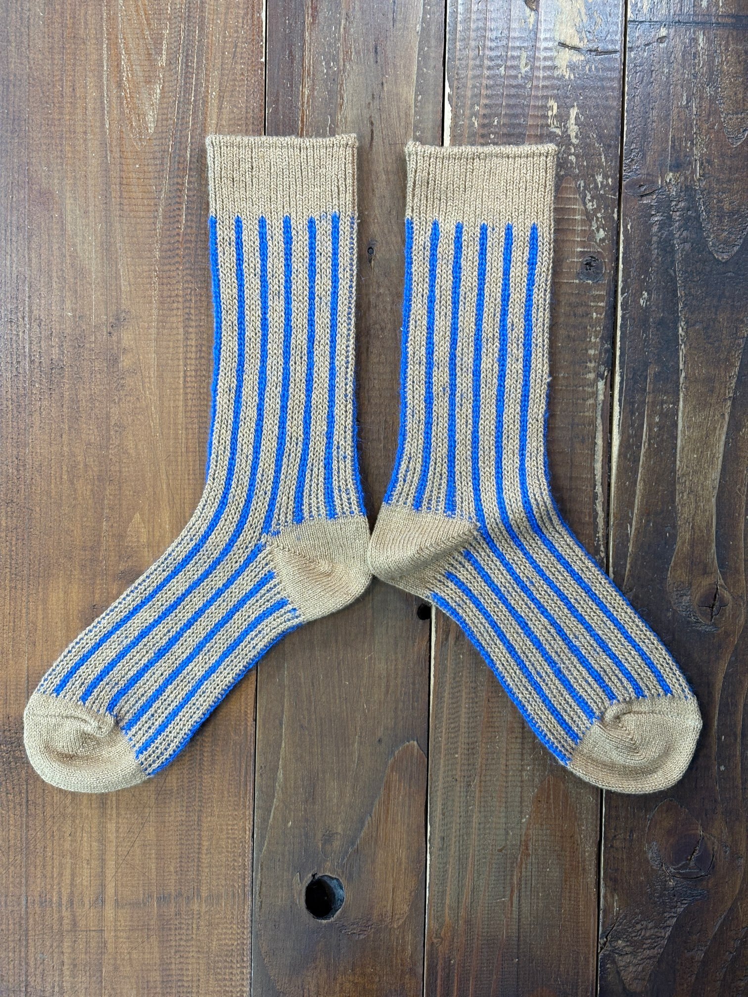 ベースにオリジナル染色を施したオーガニックコットンを使用し、ストライプ柄にモヘアをあしらったソックスです。