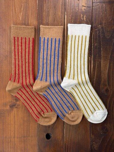 ベースにオリジナル染色を施したオーガニックコットンを使用し、ストライプ柄にモヘアをあしらったソックスです。