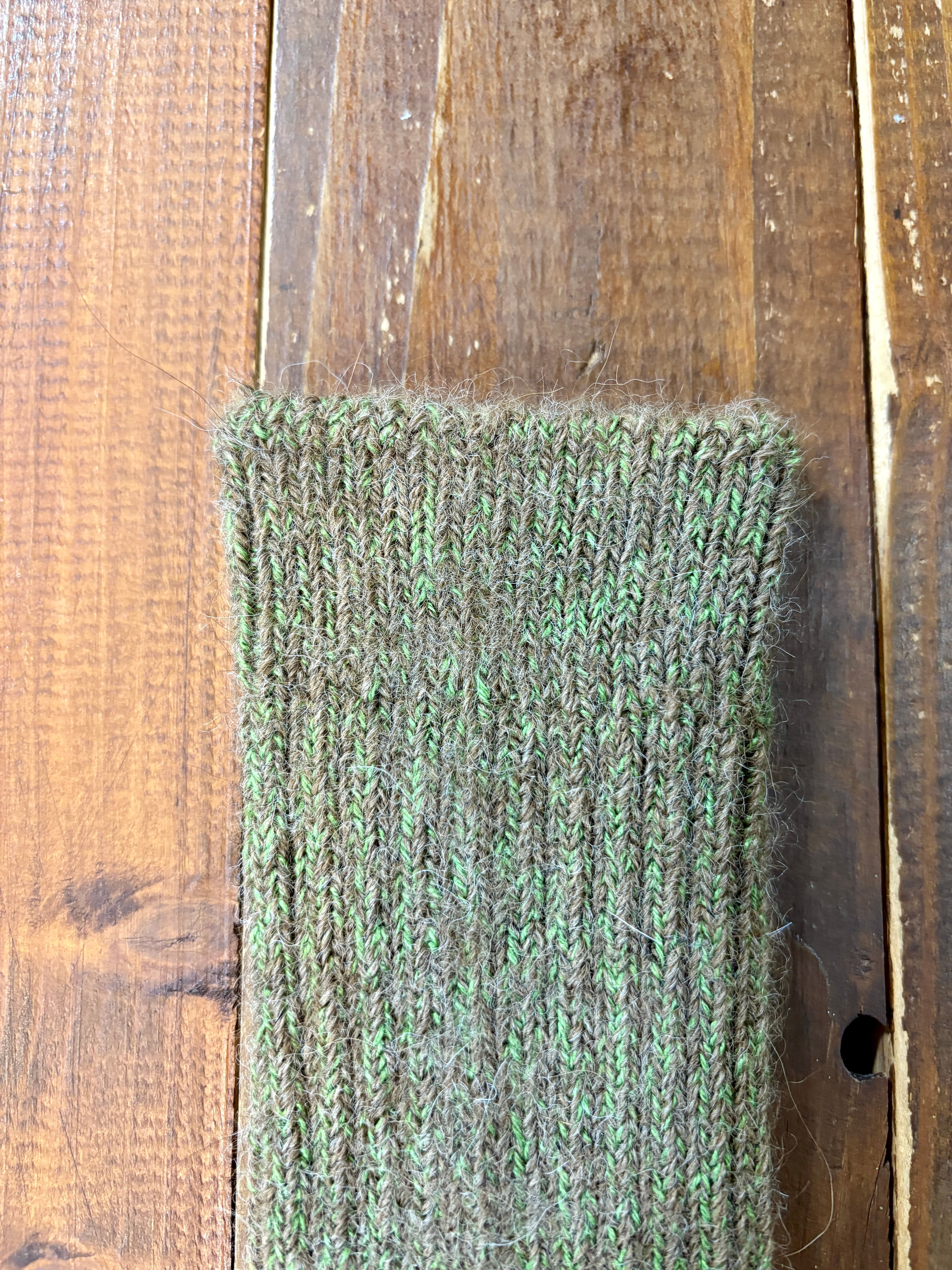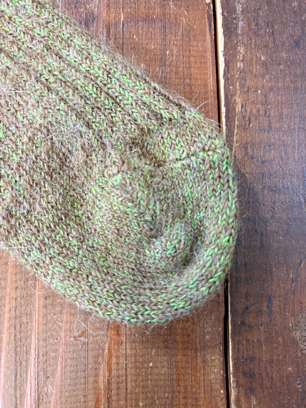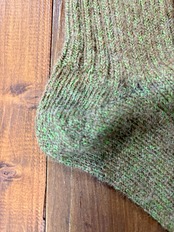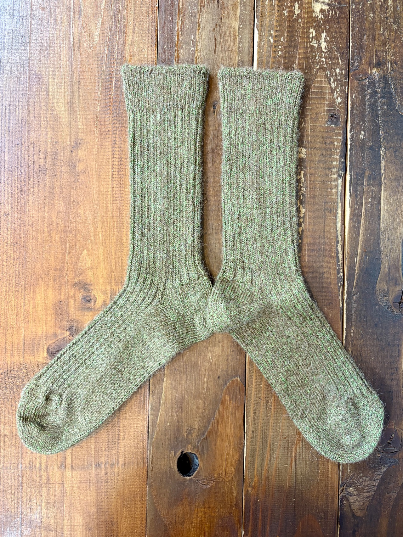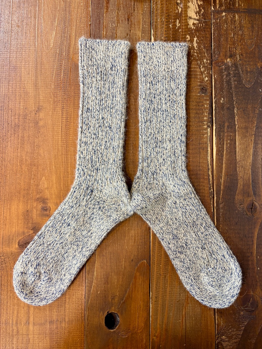 無染色のアルパカとリネンを撚糸して編み立てたリブソックスです。