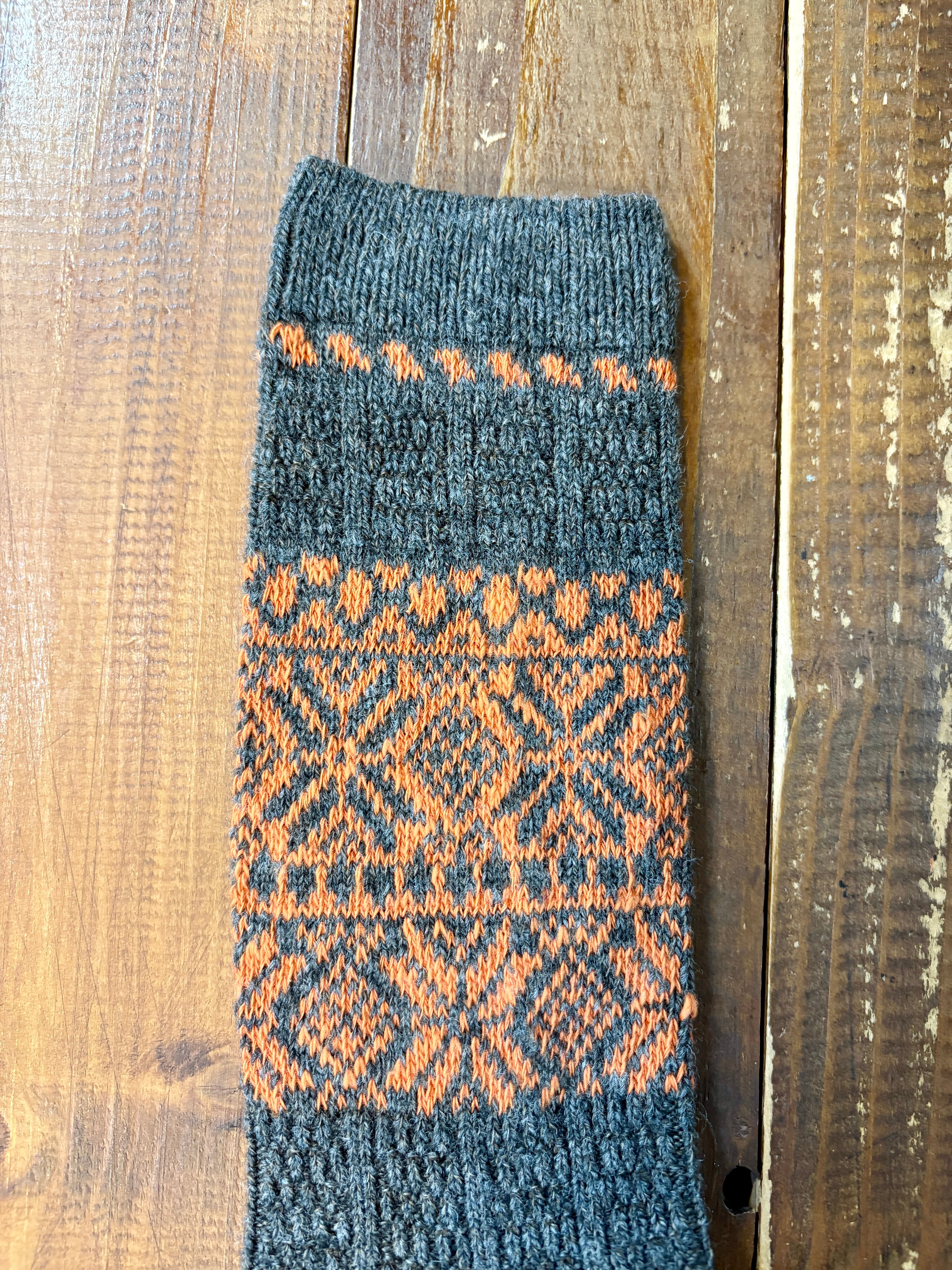 空気を多く含んだ膨らみのある紡毛と滑らかな梳毛のウールをミックスして編み立てたノルディック柄ソックスです。