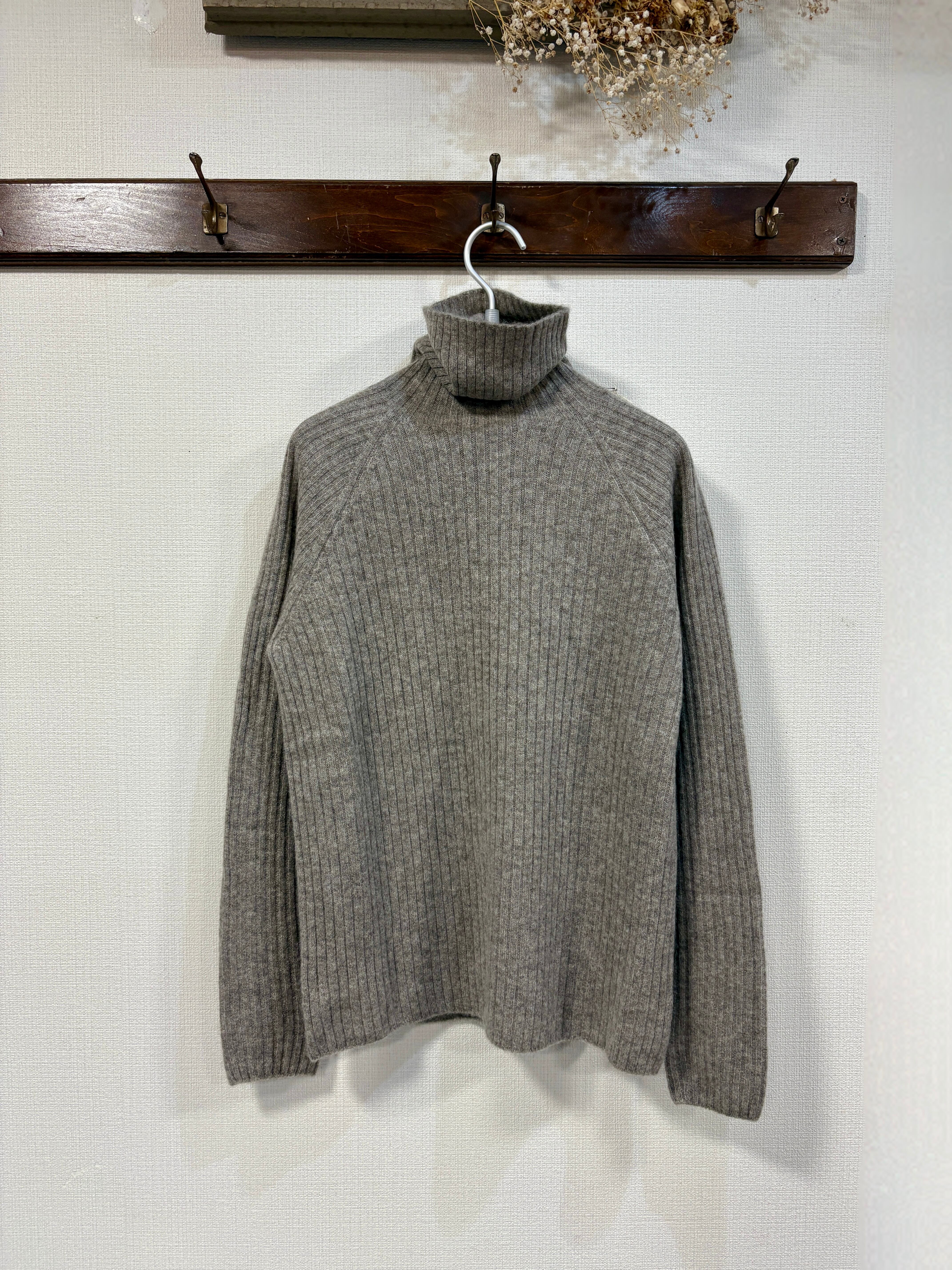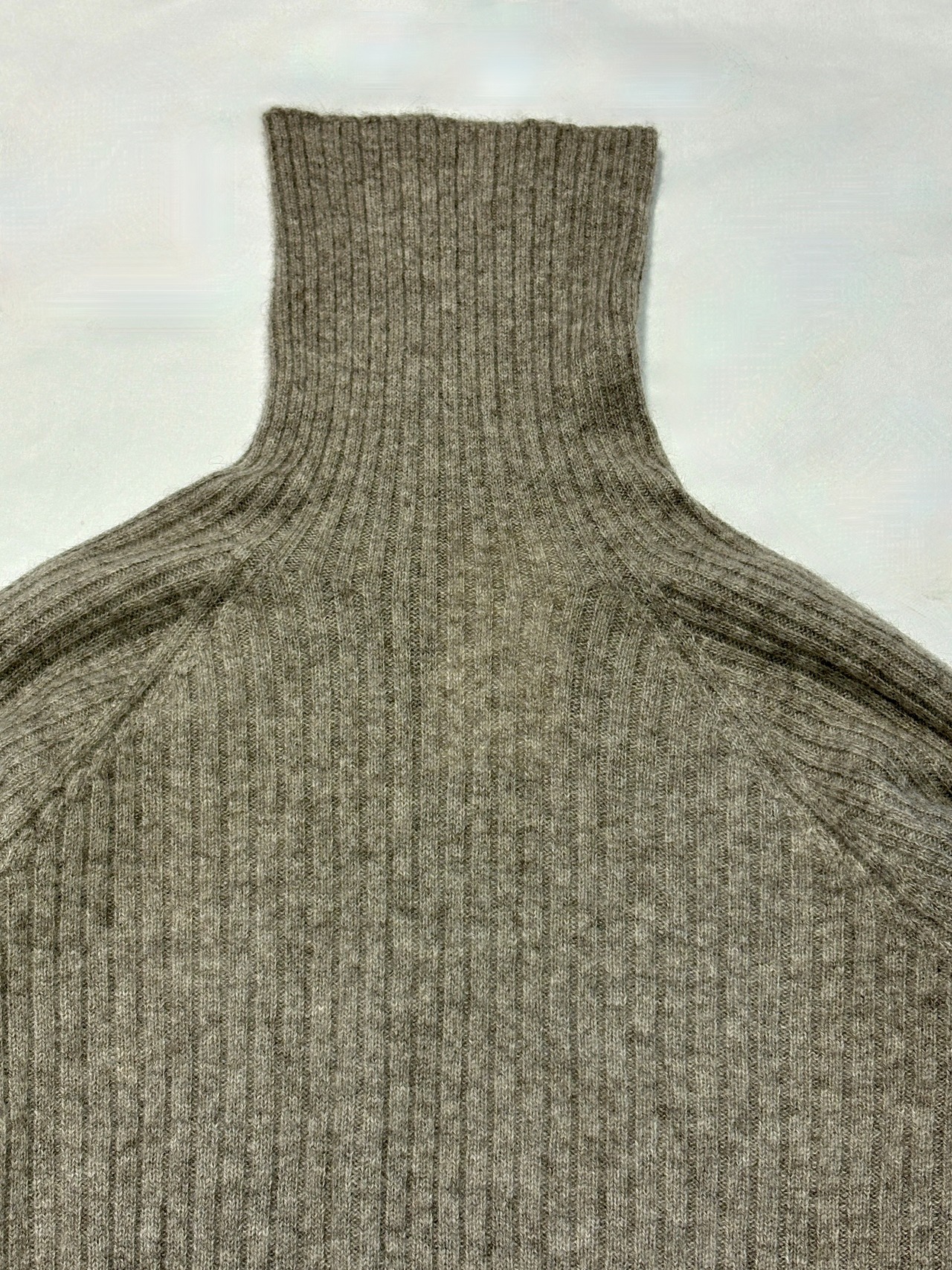ある程度体にフィットする太リブですが肩がラグランになっていたり袖丈や身丈を長めにすることで自然なゆとりを生み出すという絶妙な匙加減で単体で着てサマになるアイテムに仕上げています。
