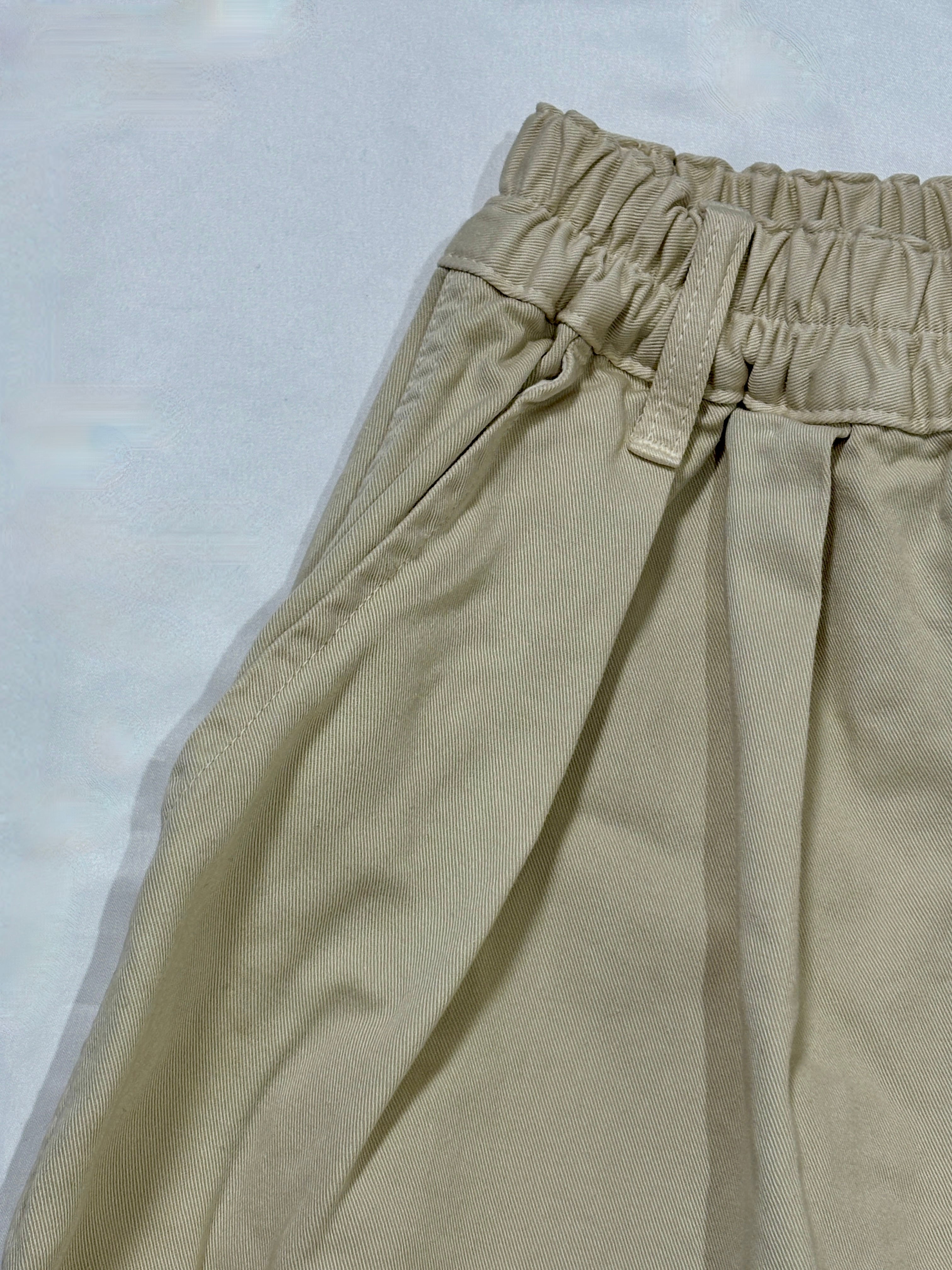 腰回りに大きくたっぷりとタックを入れて幅広の筒幅を裾で少し窄める形がユニークです。