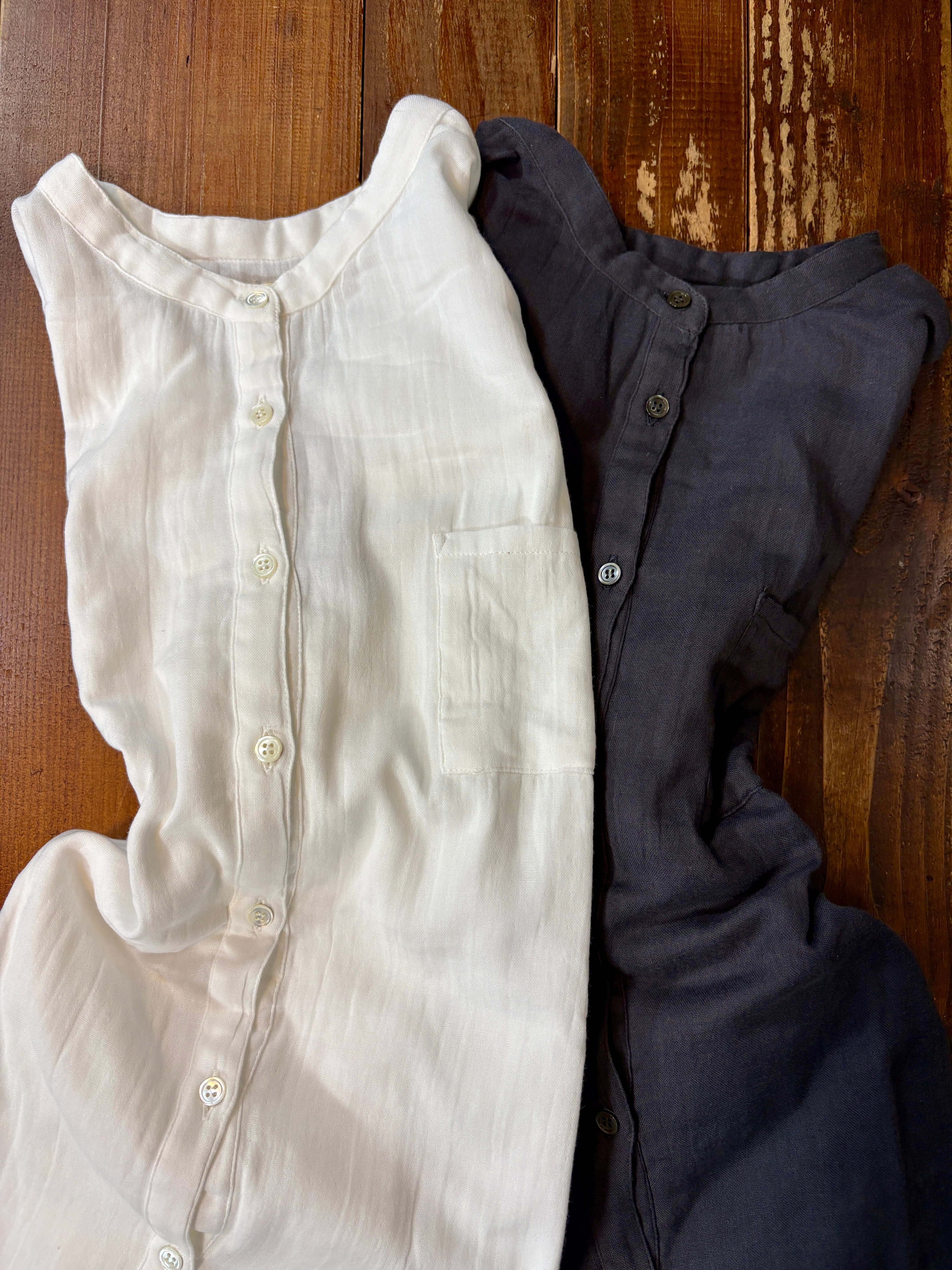 スタンドカラーなので生地の優しげな雰囲気を保ちつつもハンサムな大人らしい表情のシャツに仕上がっています。