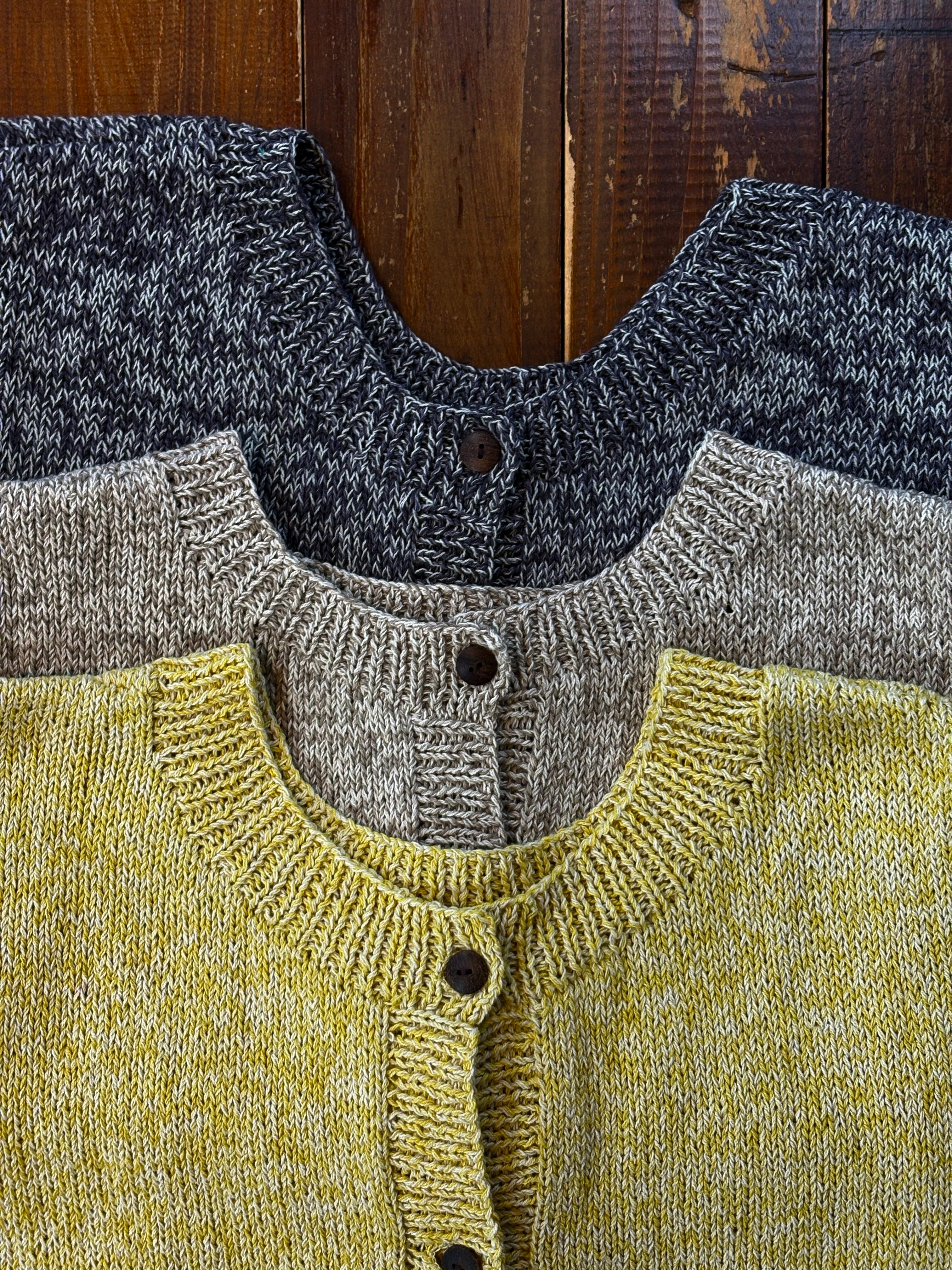 3色の糸を引き揃えて手編みした、ニュアンスカラーとざっくりとした風合いが魅力的なコットンニットベストです。