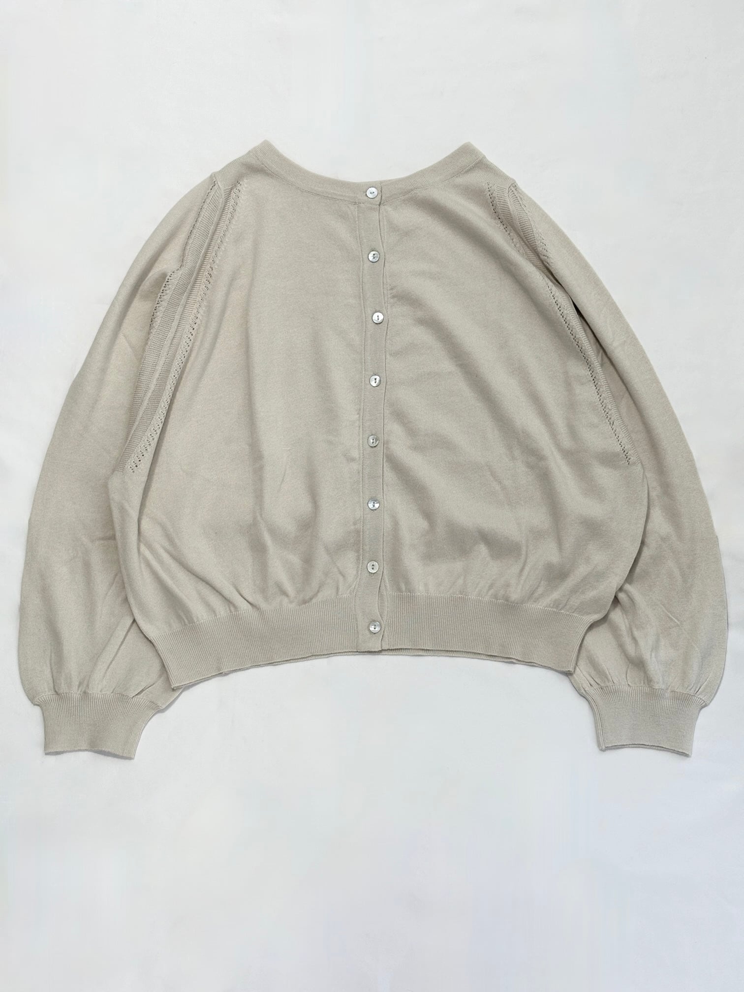 肩周りがたっぷりと余裕のあるドルマンスリーブに加えてふわりとしたボリュームのある袖が程よいフェミニンさを演出するとともに風抜けの良さという実用性も兼ね備えています。