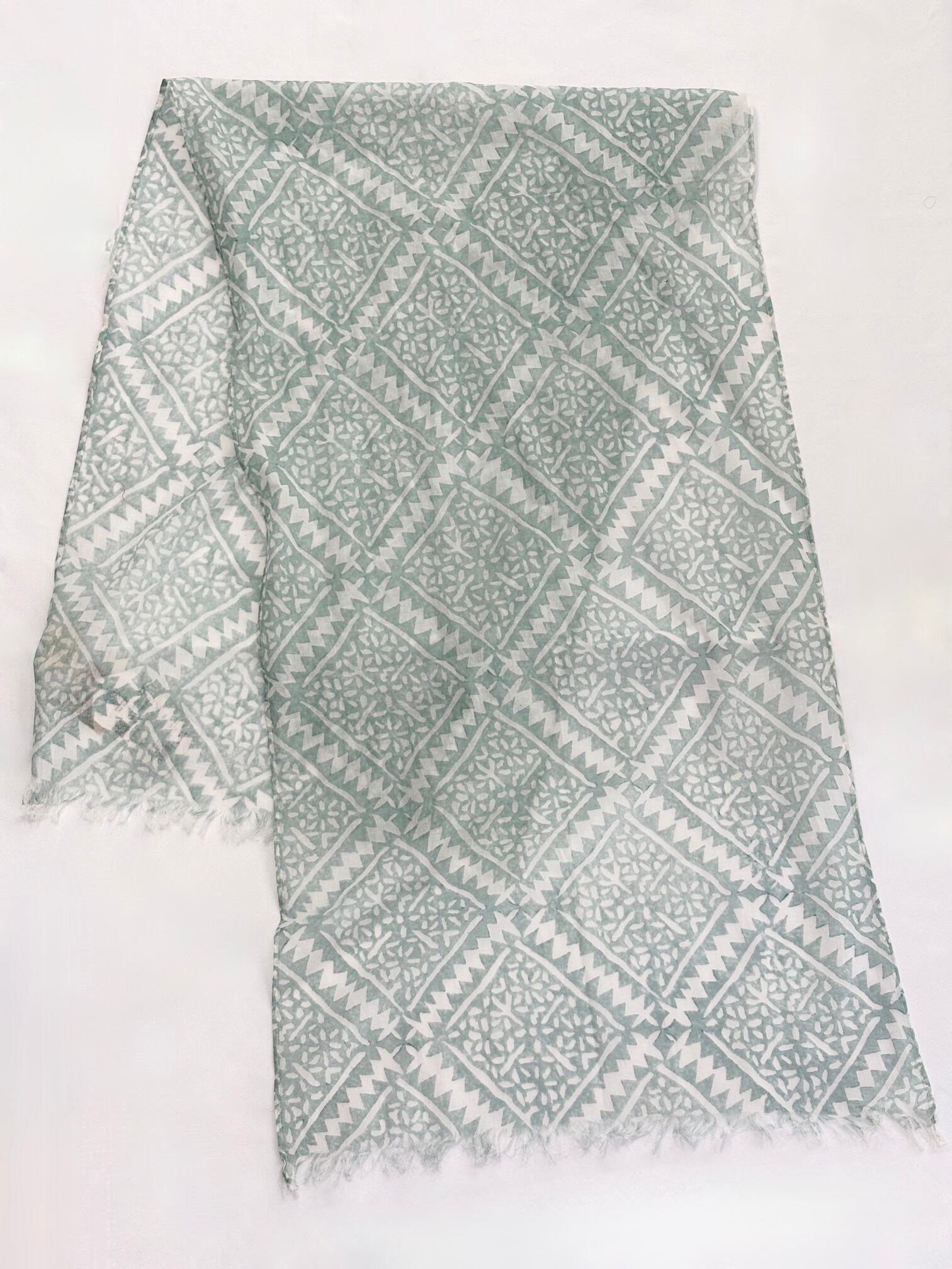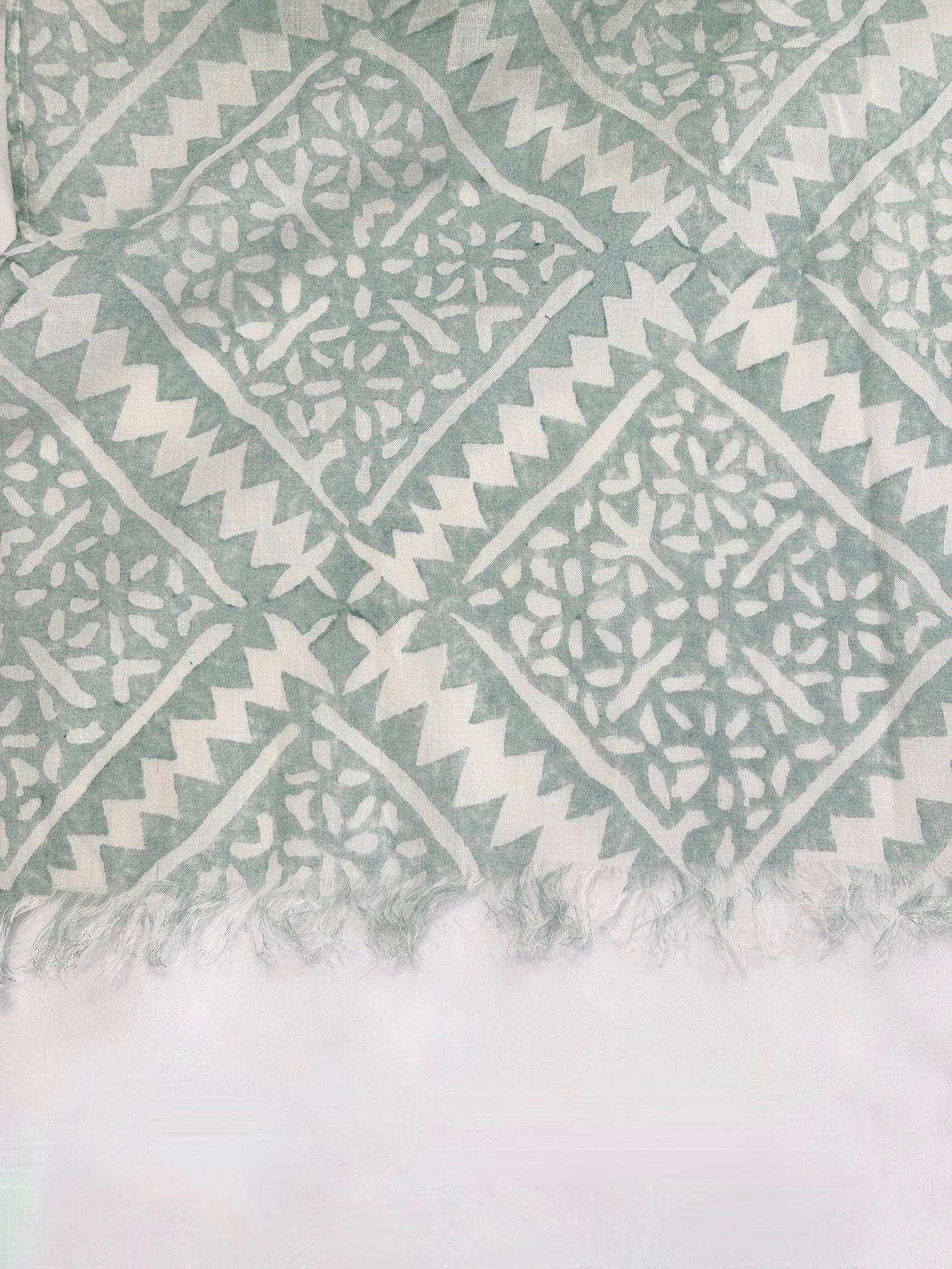 幾何学のような模様を木のハンコにして押し並べてプリントした木版の手仕事が独特の風合いを生み出しています。