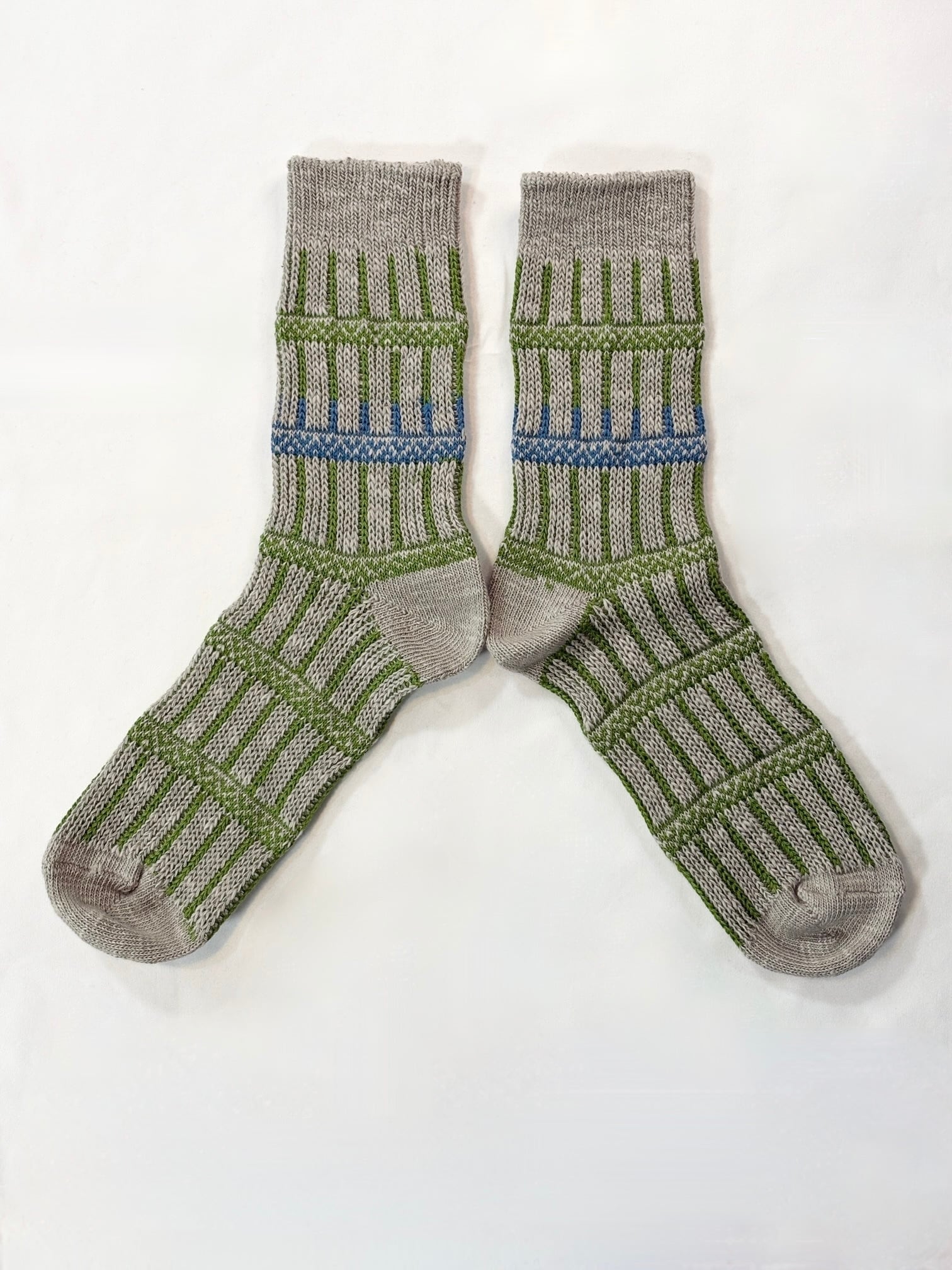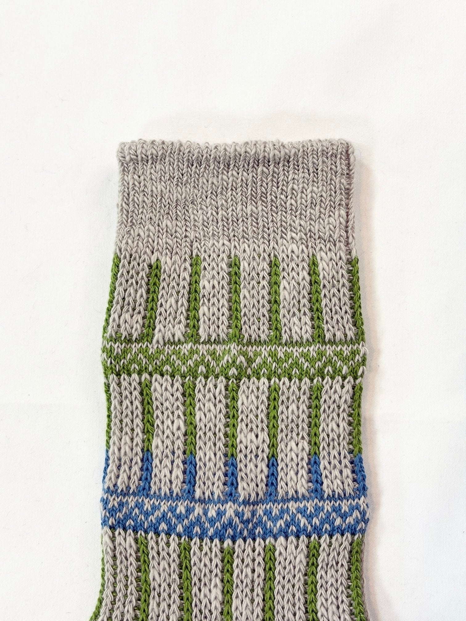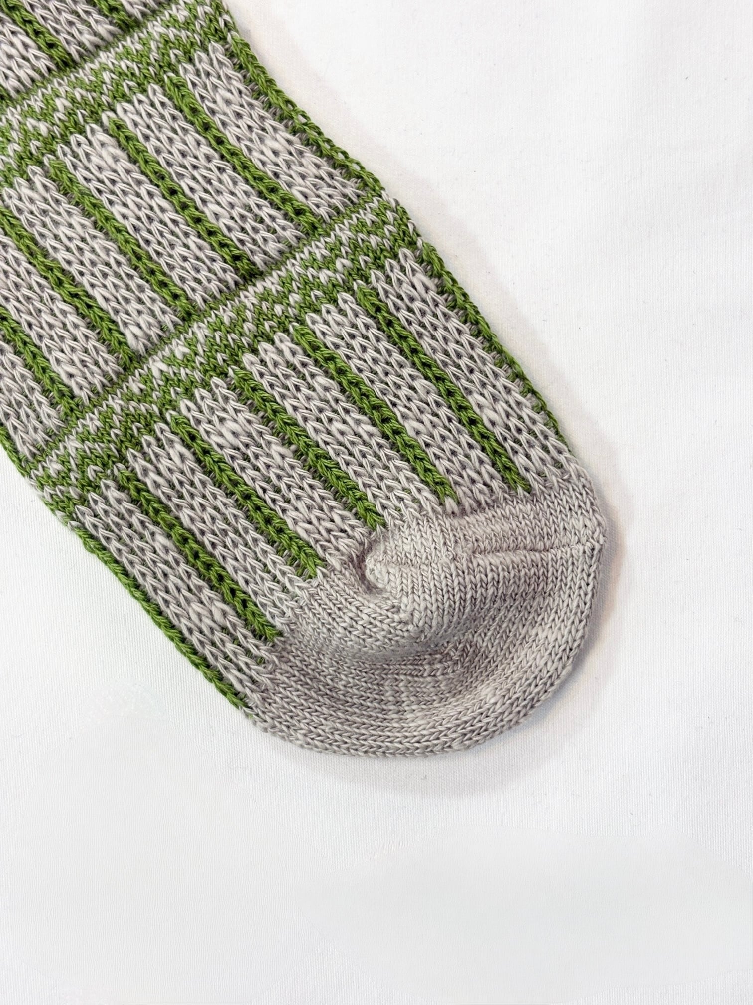 オーガニックコットンで編み立てた変則的なストライプ柄が印象的なソックスです。