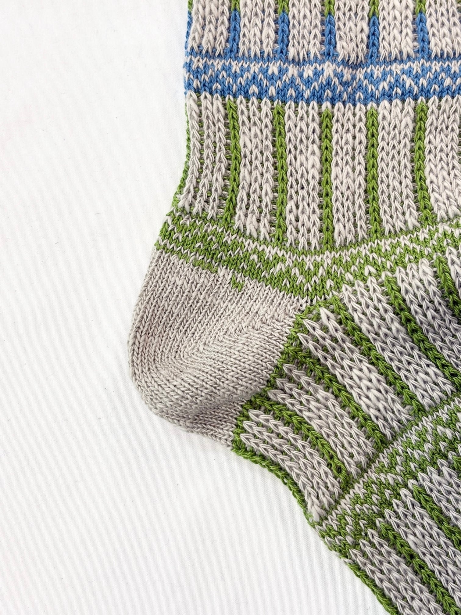縦縞の途中に入る切替がユニークで遊び心を感じさせる一足です。