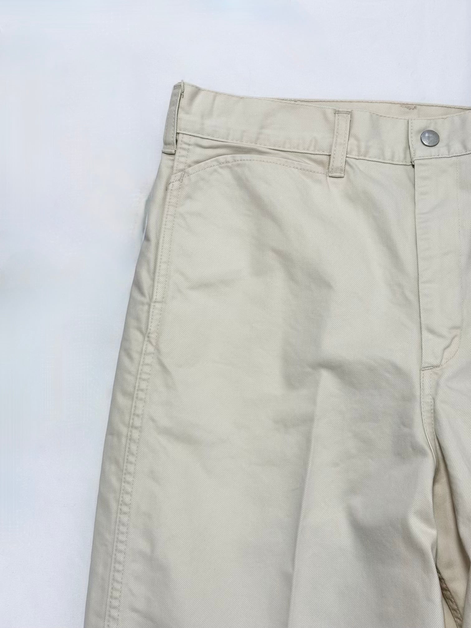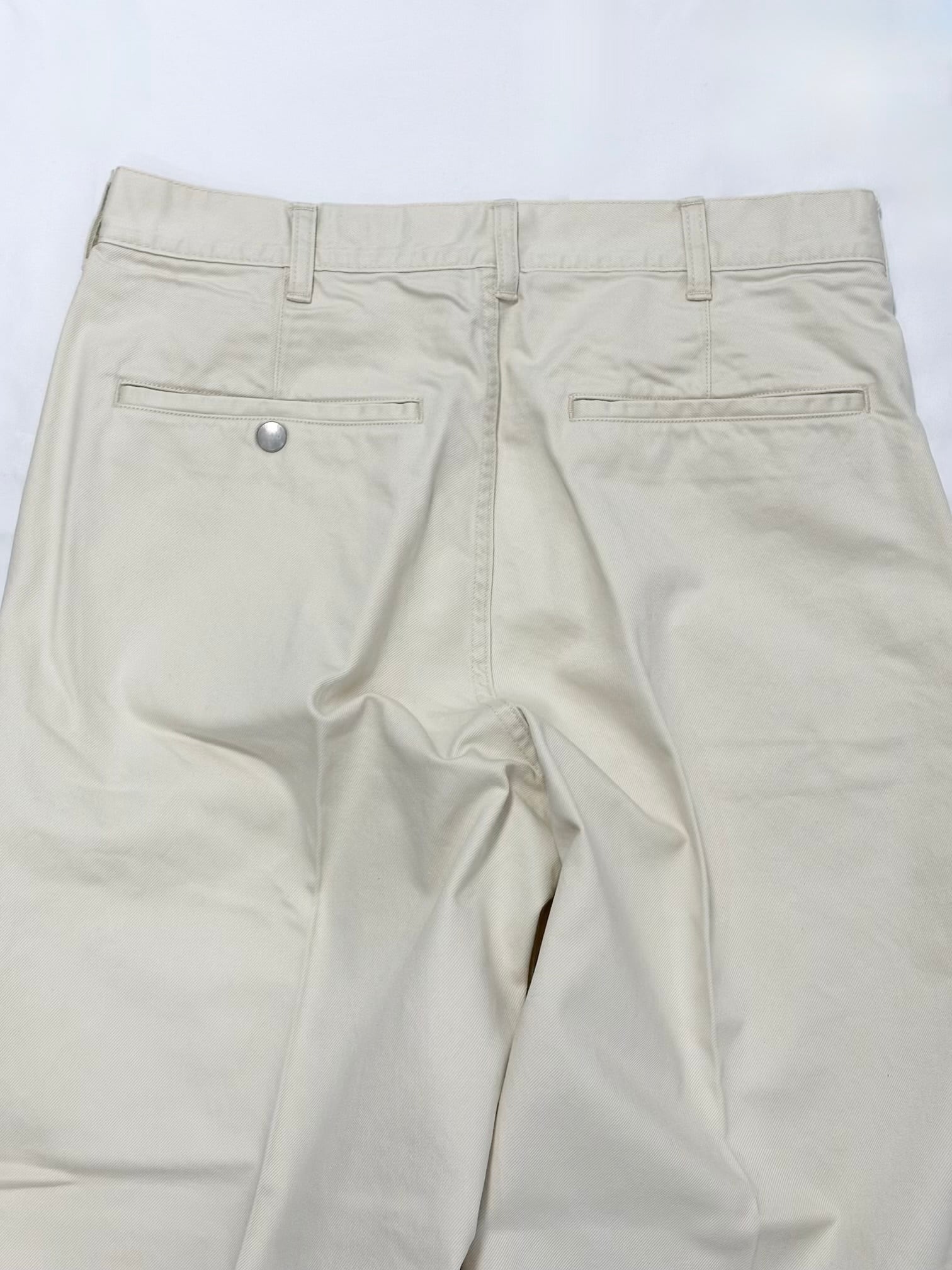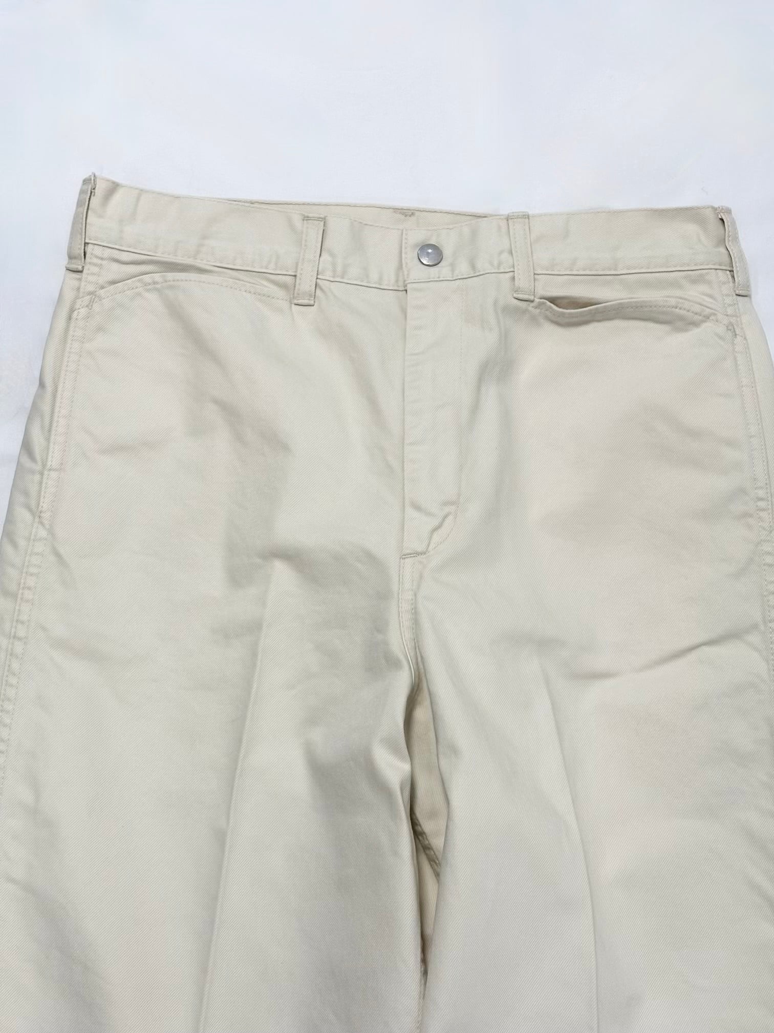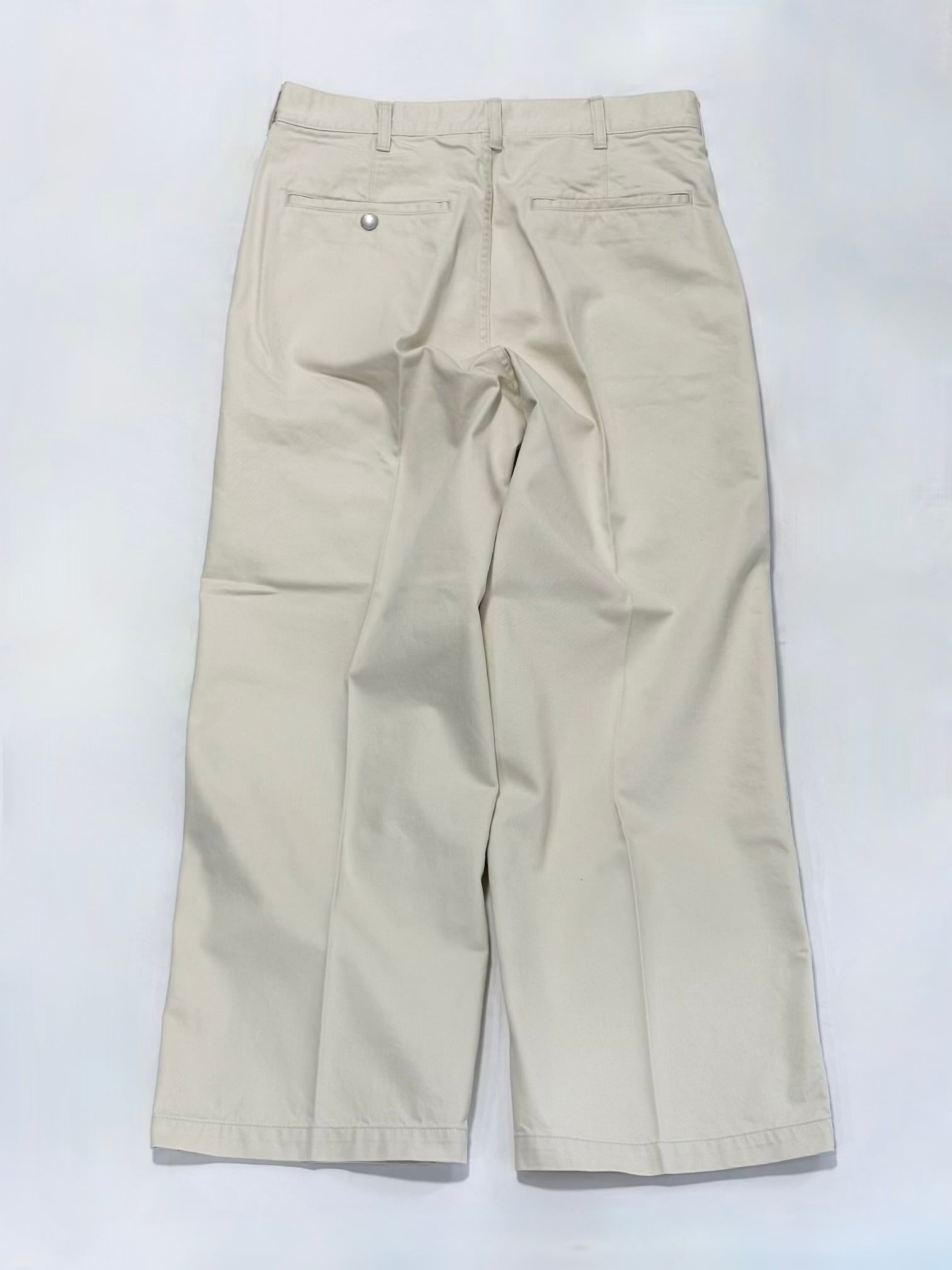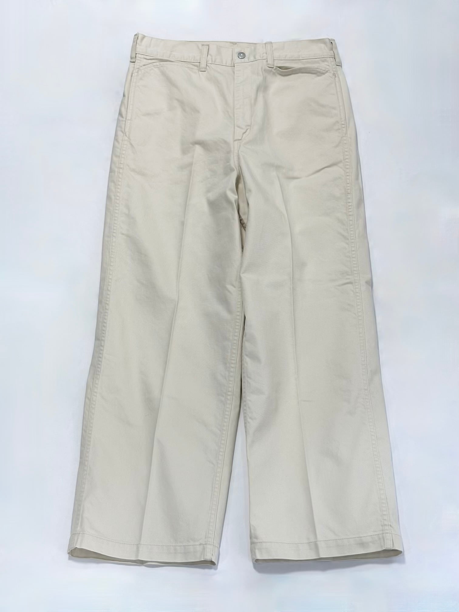 染料と顔料で2度染したフランス軍の軍パンを再生したドリル生地を用いたトラウザーパンツです。