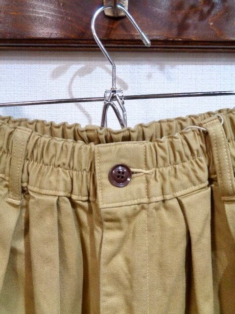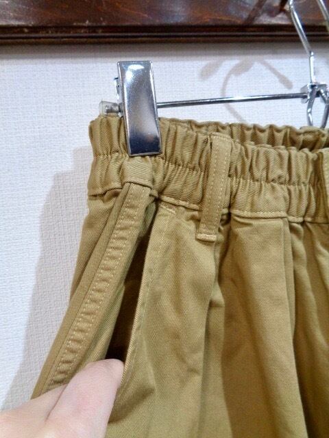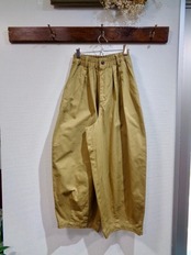 腰回りに大きくたっぷりとタックを入れて幅広の筒幅を裾で少し窄める形がユニークです。