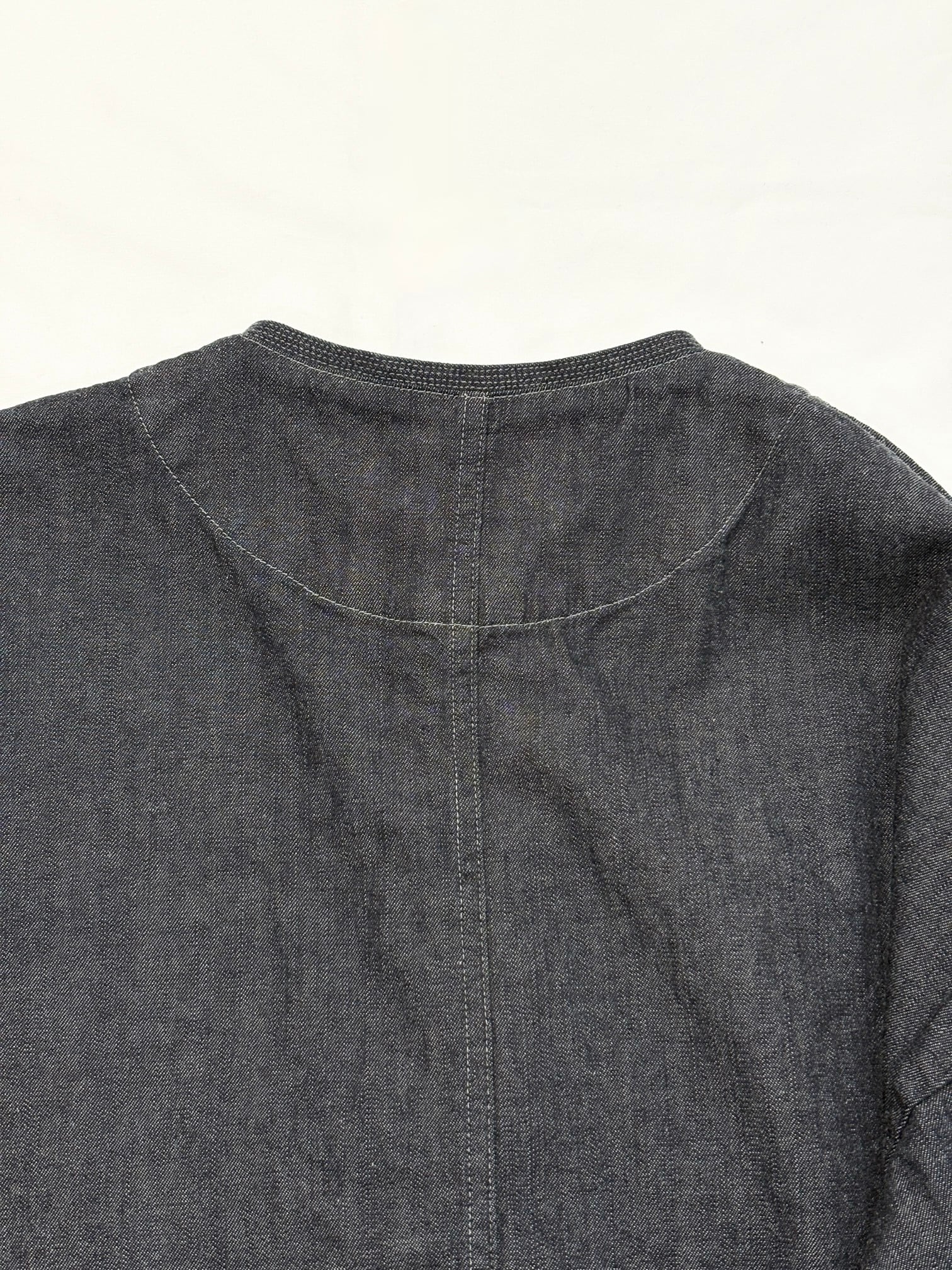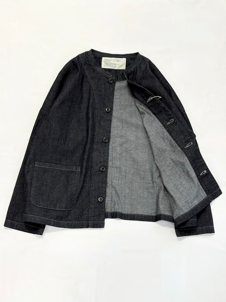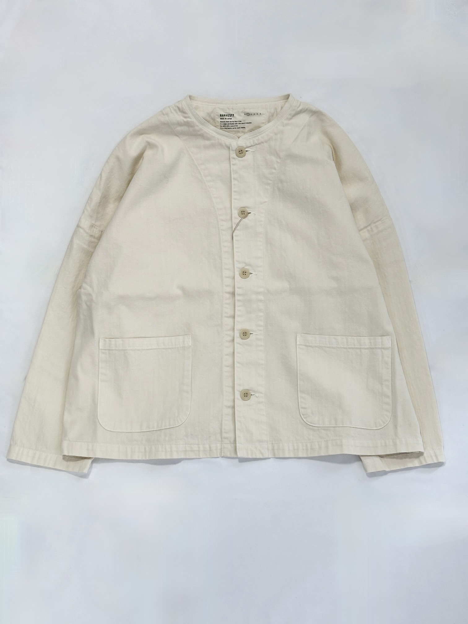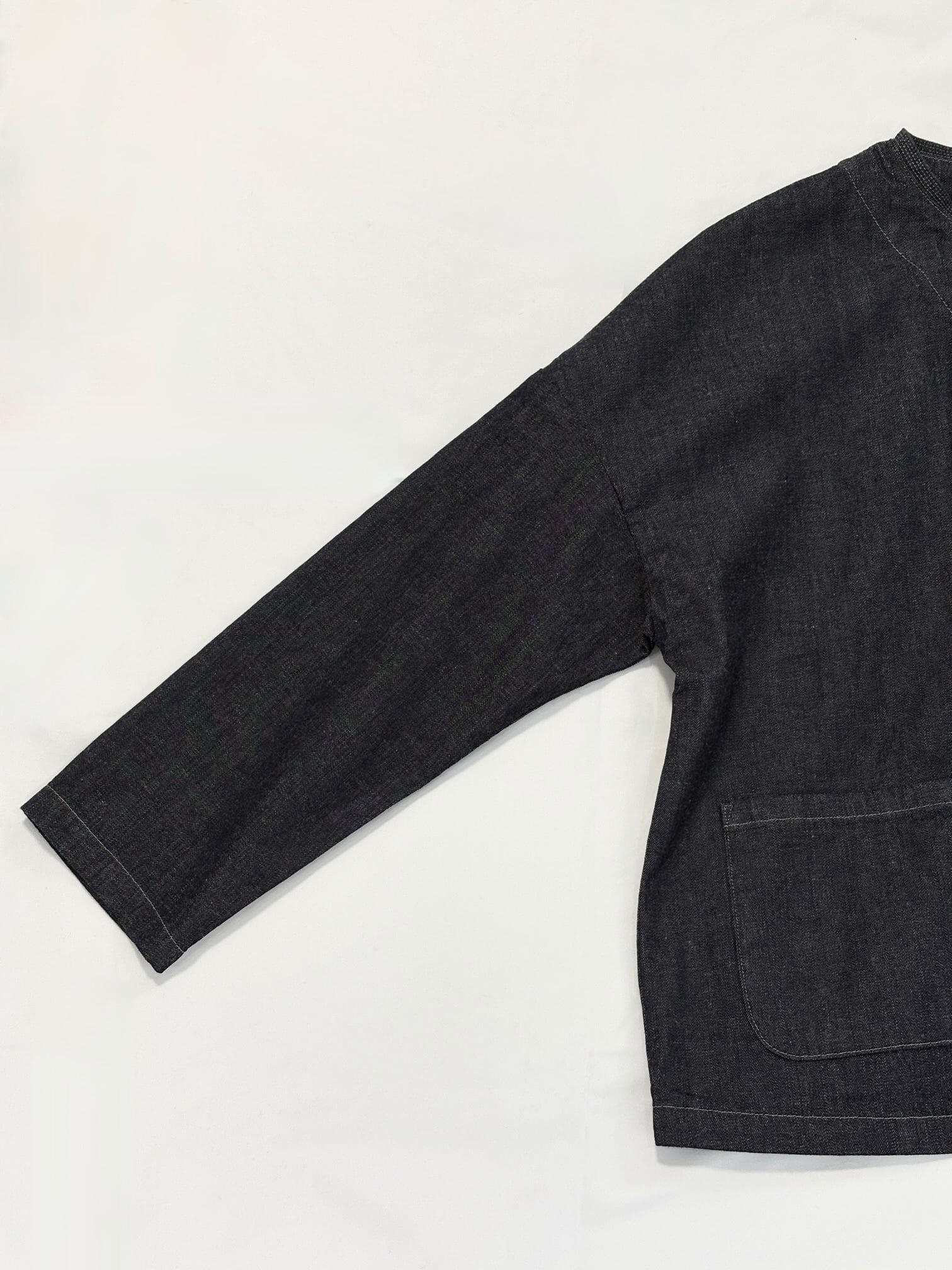 ほぼノーカラーのような小さなスタンドカラーの存在感と肩の落ちたゆったり目のシルエットが非常に良い塩梅のバランスになり、スタイリングや年齢・性別に関係なく羽織れるアウターとして仕上がっています。