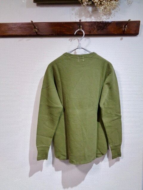 デザインはクラシカルなミリタリーサーマルをモチーフにしたクルーネックで襟、袖口に横網のヴィンテージリブを使用しています。